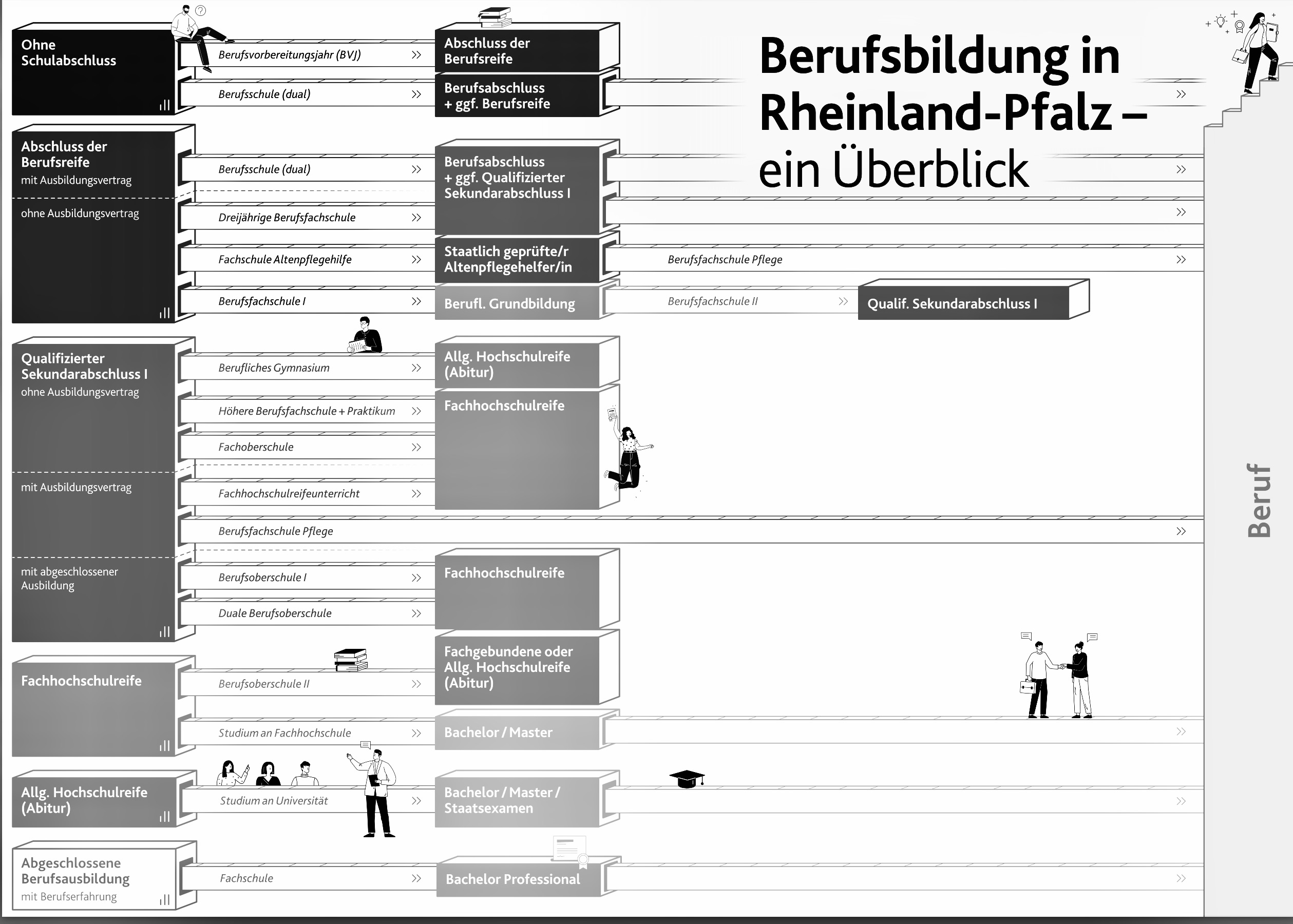 Seit vielen Jahren findet in unseren Schulformen eine intensive Beratung zur gewählten Schullaufbahn sowie anderen möglichen Schullaufbahnen statt. Eine gute Übersicht der Berufsbildung in Rheinland-Pfalz findet sich im Bildungskompass: