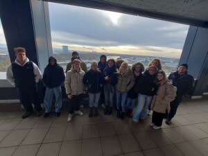 Nach einer herzlichen Begrüßung und Einführung durch Haupthafenmeister Tobias Kispert, selbst gelernter Logistiker, ging es für die SP23C direkt in luftige Höhen: Das Dach des Hochhauses der Staatlichen Rhein-Neckar-Hafengesellschaft Mannheim mbH bot uns einen atemberaubenden Blick über den gesamten Hafen und damit eine beeindruckende Kulisse aus Kränen, Hafenbecken und Schiffen. Wir hatten zudem eine sensationelle Sicht vom Pfälzerwald bis hin zum Odenwald, in der Ferne ließen sich sogar die Vogesen erahnen. Wir erhielten Infos zur Geschichte des Mannheimer Hafens, zu den Hafengebieten und zum wasserseitigen Güterumschlag, aber auch zum Pegelstand und zu den Problemen bei Niedrig- und Hochwasser.