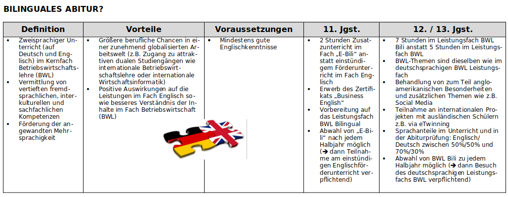 Ein besonderes Angebot richtet sich an Schülerinnen und Schüler mit sehr guten Englisch-Vorkenntnissen: Bereits seit einiger Zeit bieten wir an unserem Wirtschaftsgymnasium einen bilingualen Zweig an. Dort haben interessierte Schüler mit entsprechenden Voraussetzungen die Möglichkeit, an unserer Schule ein bilinguales Abitur und zusätzlich das Europäische Wirtschaftsabitur (EBBD) zu erwerben.