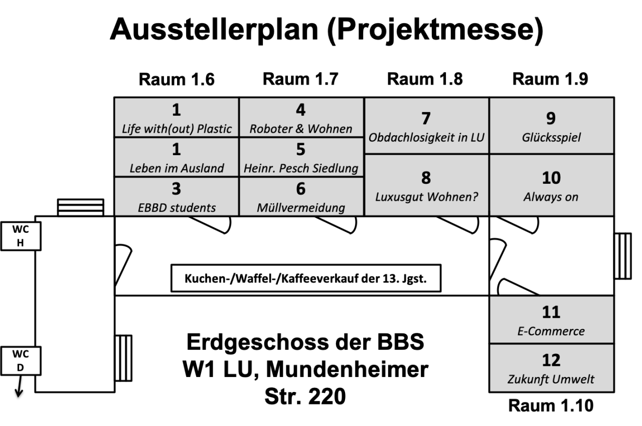Am Montag, den 28. Januar 2019 fand dann als Abschluss zur Projektwoche zwischen 8:00 und 13:00 in den Räumen 1.6, 1.7, 1.8, 1.9 und 1.10 im Hauptgebäude der BBS W1 Ludwigshafen eine große Projektmesse statt, an der die einzelnen Schülergruppen mit 12 mühevoll gestalteten Messeständen ihre Ergebnisse einem breiten Publikum (Mitschüler, Lehrer, externe Partner, Gäste, Eltern) vorstellten.